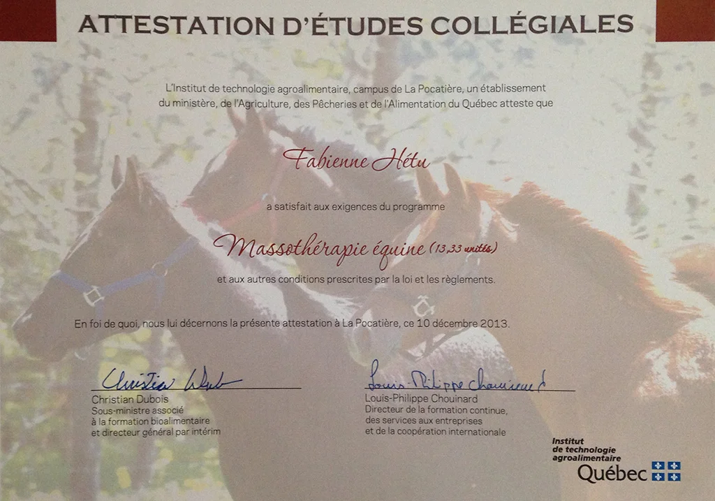 Diplômée en massothérapie équine de l’Institut de technologie agroalimentaire (ITA), campus de La Pocatière en 2013, j’ai déjà traité plusieurs chevaux et je suis à même de constater à quel point mes interventions font du bien aux chevaux et font une différence pour les cavaliers. Mon approche permet de voir les chevaux autrement, de développer un autre point de vue que celui de les monter ou de les coacher. Grâce à la massothérapie, les cavaliers apprennent à mieux comprendre certaines réactions de leur cheval et apprécient de pouvoir les soulager si nécessaire.